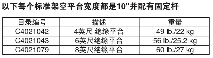 Epoxiglas®绝缘平台包括两根橙色2"直径Epoxiglas棒连接在平台 上,以安装支架。其他公司的平台 不包括这些绝缘部分。和其他绝缘工具一样绝缘平台也满足: OSHA子附件V,1926.951(d)和ASTM 711。Epoxiglas部件的清 理和保存同Chance带电工具相同。
